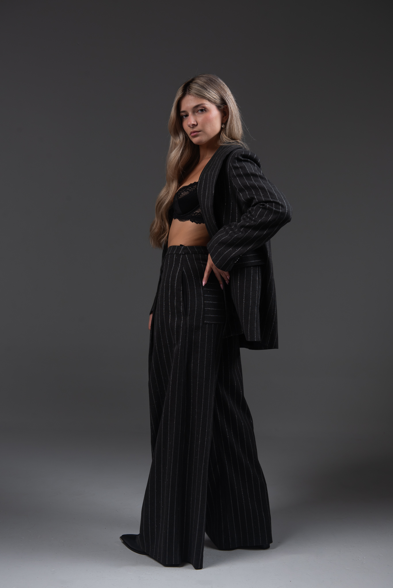 Κομψό παντελόνι με φαρδιά γραμμή, με ριγέ λεπτομέρειες και μοντέρνα αίσθηση,